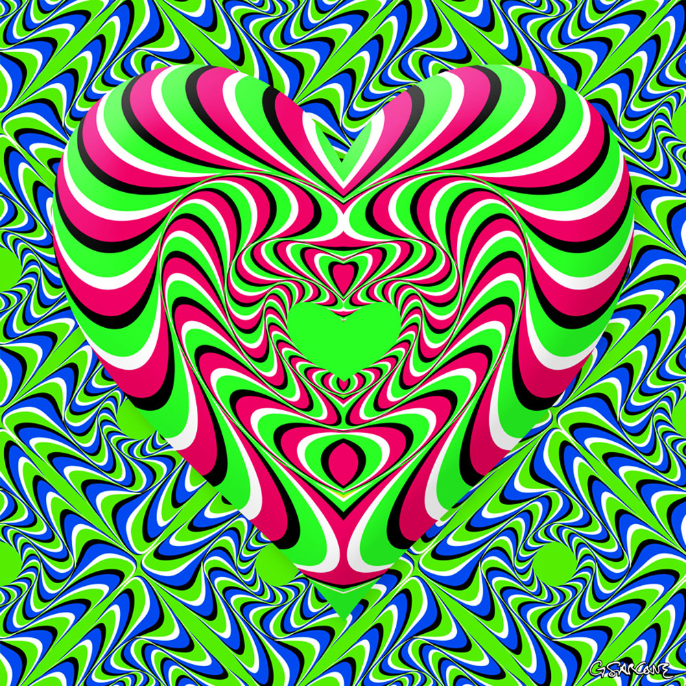The heart and its vibrant backdrop seem to swirl and move as your gaze drifts — a still image that pulses with life.