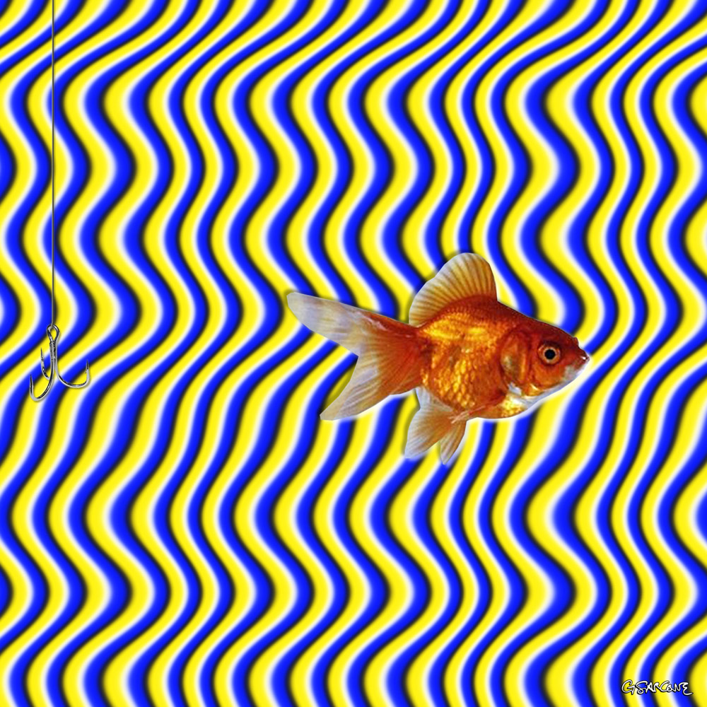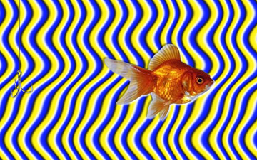 The goldfish appears to swim away from the bait — caught in motion, yet perfectly still.