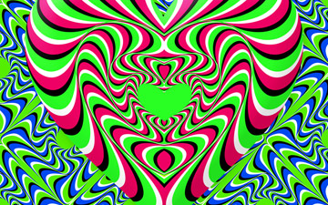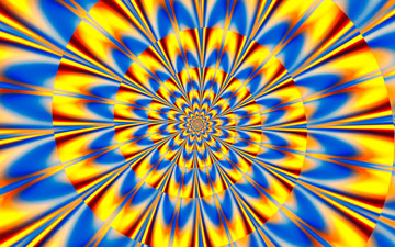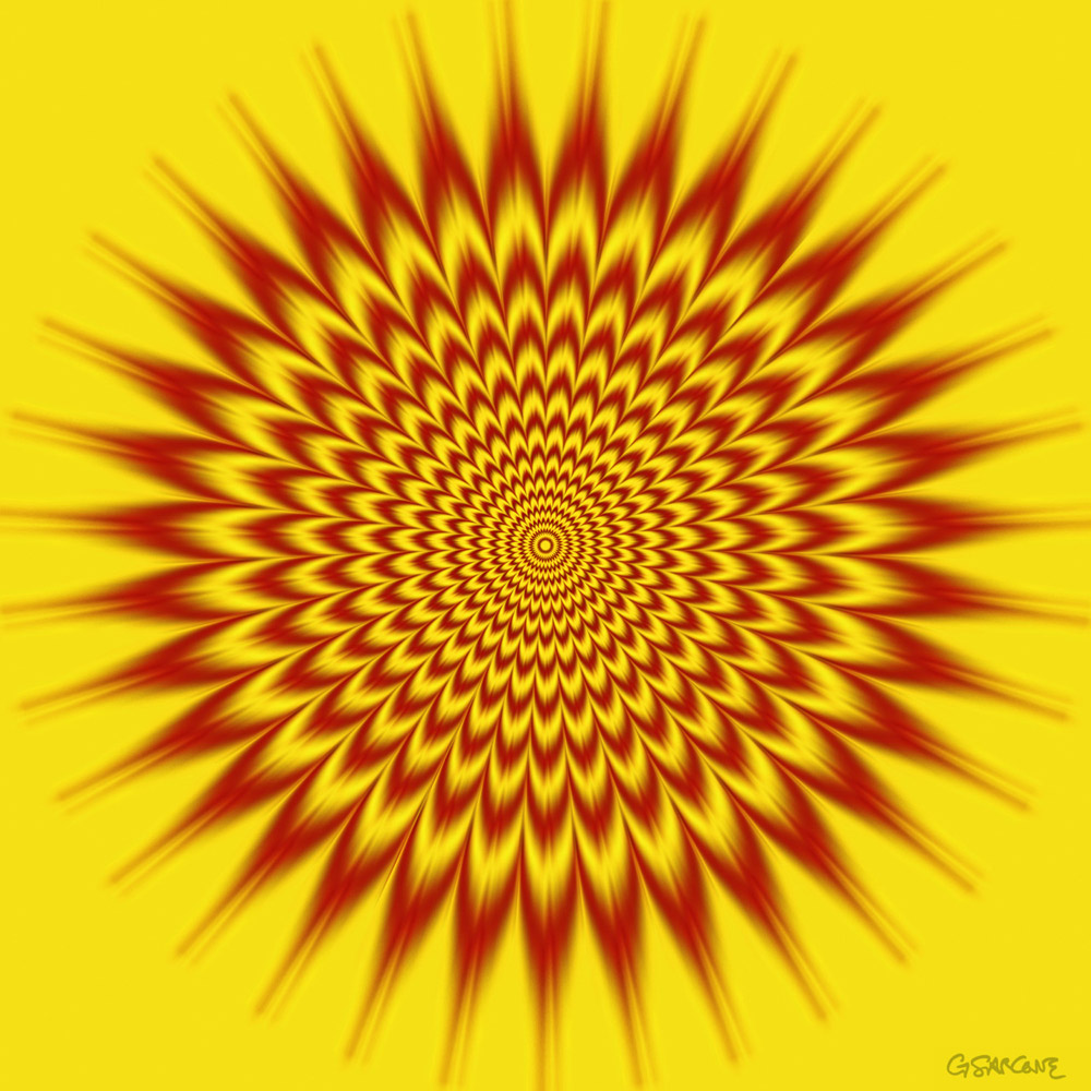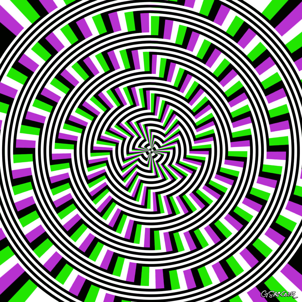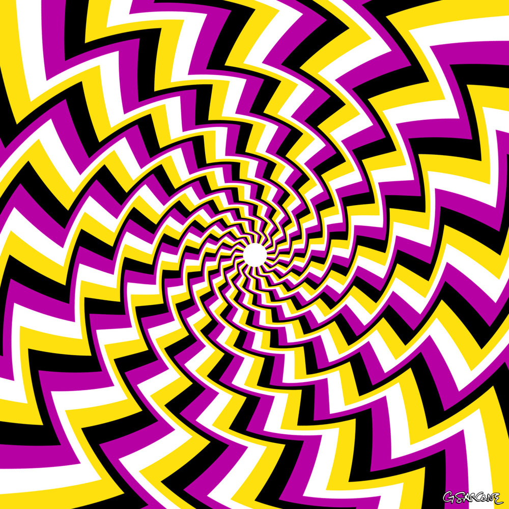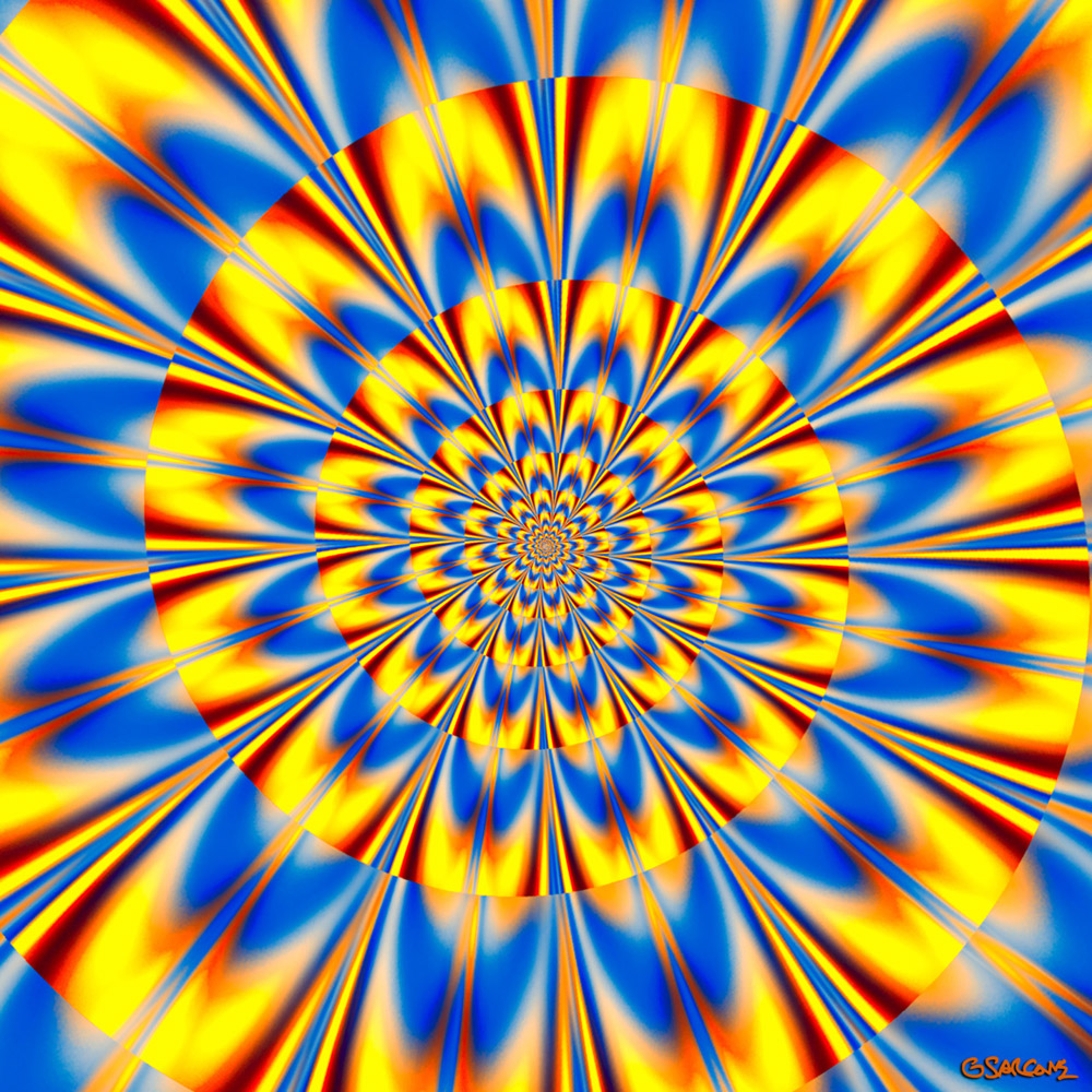 This Op Art piece features a spiral in blue, red, and yellow that seems to flash and pulse as you gaze into it.